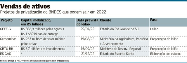 O Banco Nacional de Desenvolvimento Econômico e Social (BNDES) prevê que é possível tirar do papel, ainda em 2022, mais quatro privatizações, em estruturação pelo banco de fomento: a geradora de energia gaúcha CEEE-G; a empresa de mobilidade urbana CBTU de Belo Horizonte; a distribuidora de gás ES Gás, e a Ceasaminas (de abastecimento de produtos alimentícios).