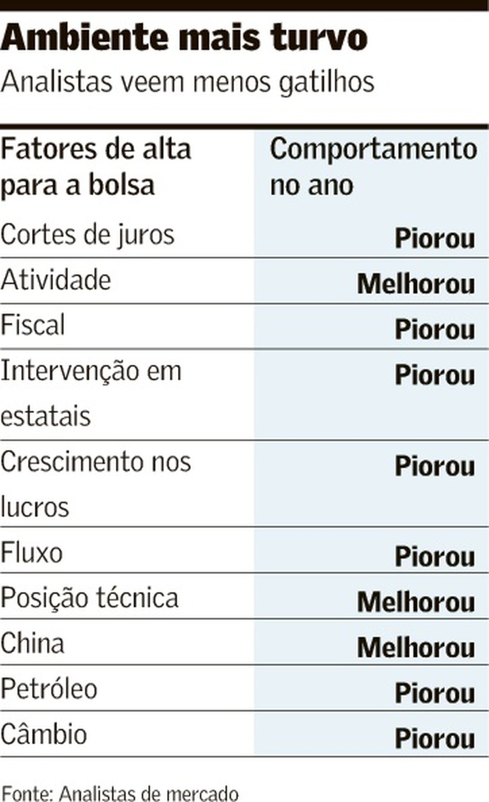 “O Brasil acrescentou dificuldades internas à questão do Fed”, diz Barros, do UBS BB. “Tivemos a questão do fiscal, e também houve discussões sobre o CEO da Vale e os dividendos da Petrobras”, aponta ele. A interferência nas estatais é mais um fator que mudou expressivamente desde o começo do ano, com efeitos sobre o desempenho da bolsa.