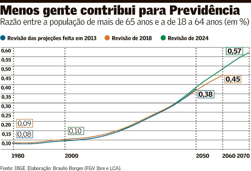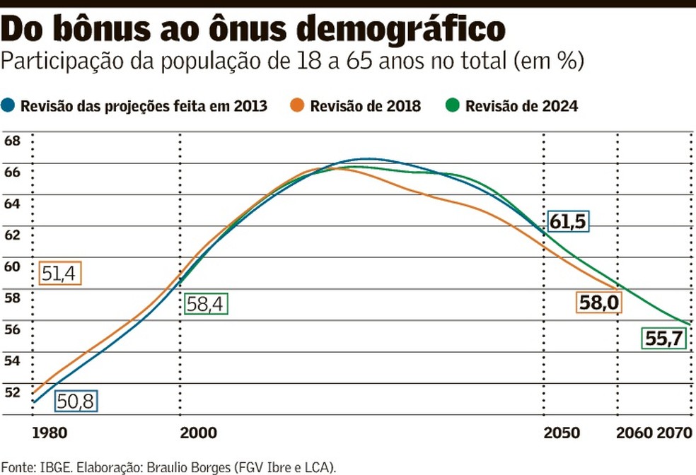 “A população já vem desacelerando, passou de um crescimento de 2,5% ao ano nos anos 1970, para 2,1% nos anos 1980, 1,6% em 1990, 1,2% a partir de 2001, e nos últimos três, quatro anos o crescimento está em 0,4%, bem abaixo do 0,7% projetado em 2018”, afirma Borges. “Com base nas projeções populacionais da revisão do IBGE de agosto, até o fim da década atual o crescimento desacelera para 0,3%, o que deve continuar. Essa dinâmica demográfica mais desfavorável traz implicações, e temos de levar isso em consideração nas discussões.”