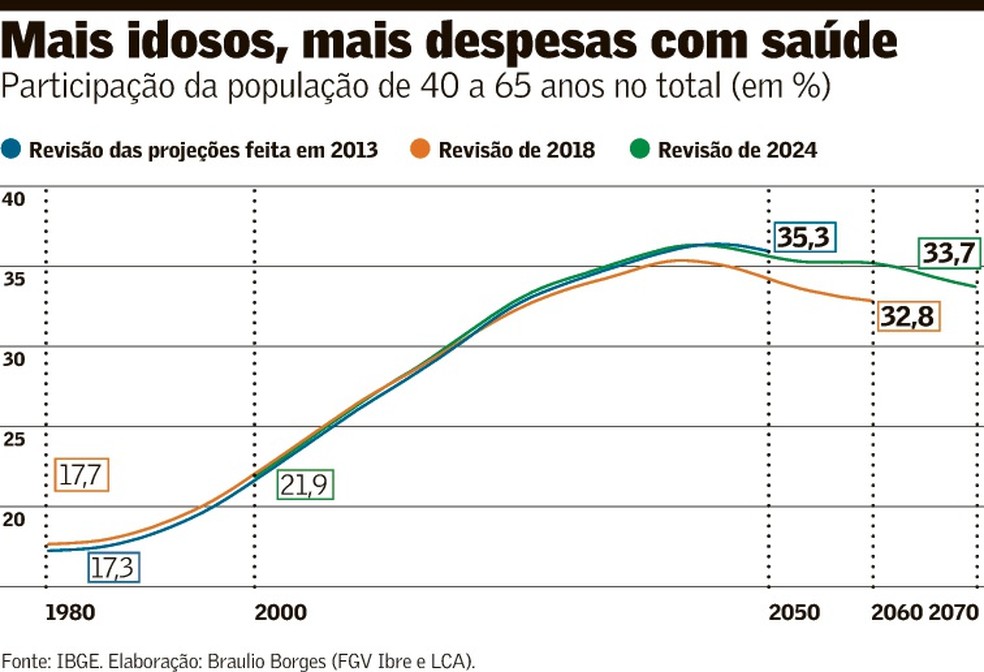 Levantamento feito por Braulio Borges, pesquisador do FGV Ibre e economista sênior da LCA Consultores, mostra que com as novas perspectivas demográficas divulgadas pelo IBGE em agosto, o cenário no curto prazo é menos impactante, mas a partir de 2040 os gastos envolvendo plano de saúde, medicamentos e aposentadoria devem começar a subir com força.