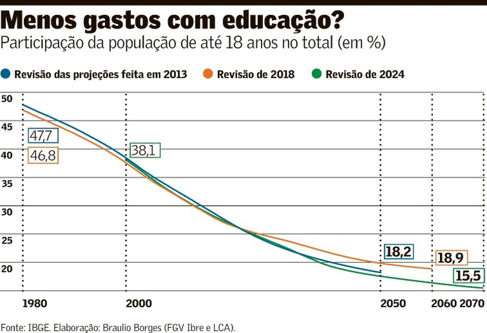 Ao contrário de gastos com saúde e Previdência, os gastos com educação pública e privada devem diminuir no futuro, acompanhando a queda da população de até 18 anos, que passará de 25,3% do total atualmente para 19,3% em 2040.
