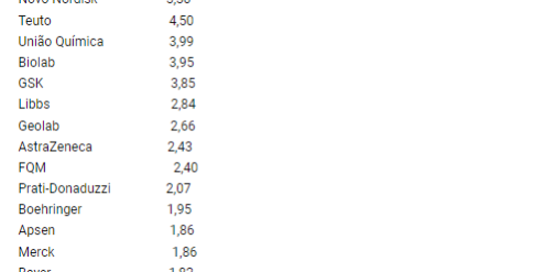 Das farmacêuticas com faturamento bilionário, 22 registraram avanço superior a dois dígitos. A que mais cresceu percentualmente foi a Novo Nordisk, embora o resultado não tenha sido suficiente para mudar sua posição no ranking geral – 8º lugar.