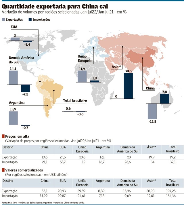 No total das exportações brasileiras, ainda segundo o Icomex, o volume embarcado aumentou em 0,6%. Ainda em termos de quantidade e mantendo a comparação de janeiro a julho contra igual período de 2021, os embarques aos Estados Unidos cresceram 3% e à União Europeia, 11,9%. Para os argentinos, a expansão foi de 13,9% e para os demais países da América do Sul, de 14,3%. Para a Ásia, excluindo-se Oriente Médio e China, houve estabilidade.