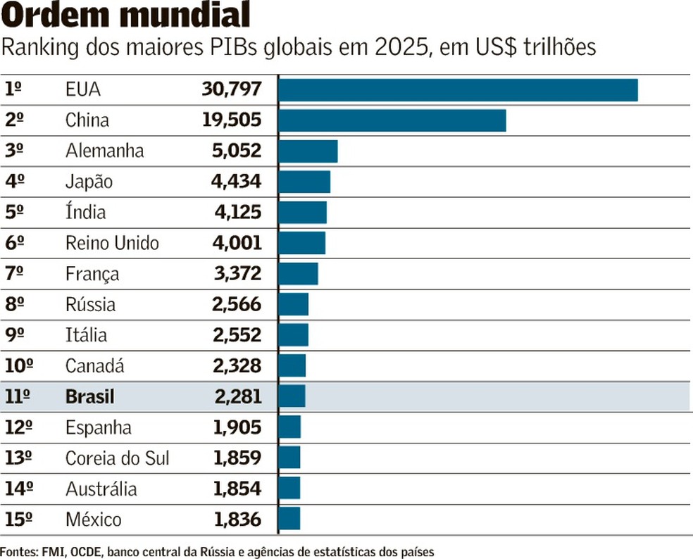 A queda do Brasil para o 11º já era aguardada desde outubro do ano passado, quando o Fundo Monetário Internacional (FMI) revisou suas projeções para a economia global e apontou o avanço russo. Mas o cenário desde então trouxe algumas surpresas.