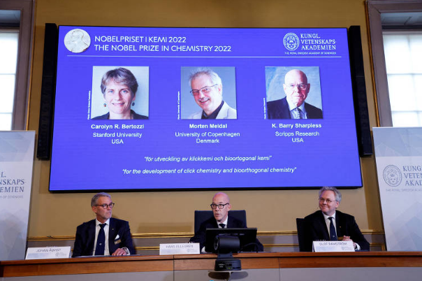 Um trio de cientistas – Carolyn Bertozzi, Morten Meldal e K. Barry Sharpless – é o vencedor do Prêmio Nobel de Química de 2022, conforme anunciou a Real Academia Sueca nesta quarta-feira, 5. Segundo os organizadores do prêmio, esses pesquisadores conseguem tornar processos químicos complexos mais fáceis e seus estudos contribuem com o avanço de descobertas farmacêuticas.