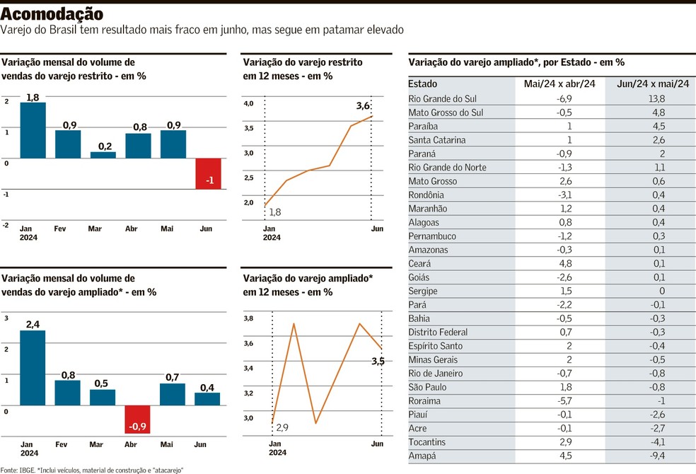 O resultado do varejo brasileiro em junho veio abaixo do projetado pelos economistas, que já esperavam números mais fracos do que nos últimos meses. Os dados reforçaram a perspectiva de que o segundo semestre será de acomodação no setor. As informações não alteraram, porém, as avaliações de que o Produto Interno Bruto (PIB) do segundo trimestre será forte e o varejo fechará 2024 com alta.