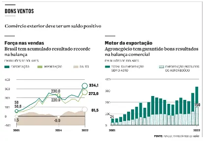 A conjuntura mais positiva deve fazer com que o Brasil colha um novo ano de bom resultado da balança comercial. Uma parte dos bancos e consultorias prevê um superávit acima de US$ 70 bilhões em 2023, o que marcará um recorde se confirmado.