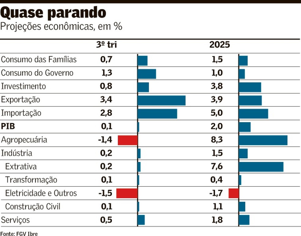 O Ibre revisou seus números e agora espera uma expansão ligeiramente menor no terceiro trimestre de 0,1%. Mas também vê o PIB desacelerar pouco de 2025 para 2026 – de 2,0% para 1,8%.