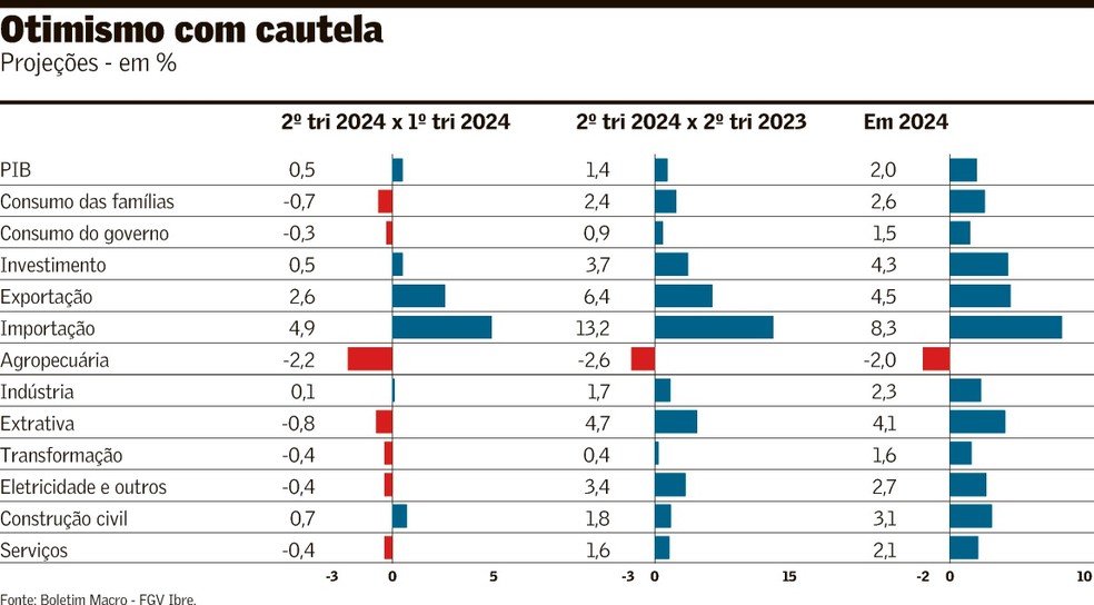 Na edição de junho, o boletim considera para o segundo trimestre efeitos negativos do desastre no Rio Grande do Sul, apesar de esperar rápida recuperação devido aos pacotes governamentais. A projeção é de crescimento de 0,5% do PIB no segundo trimestre, ante o primeiro. E de alta de 2% na comparação com o mesmo trimestre de 2023.
