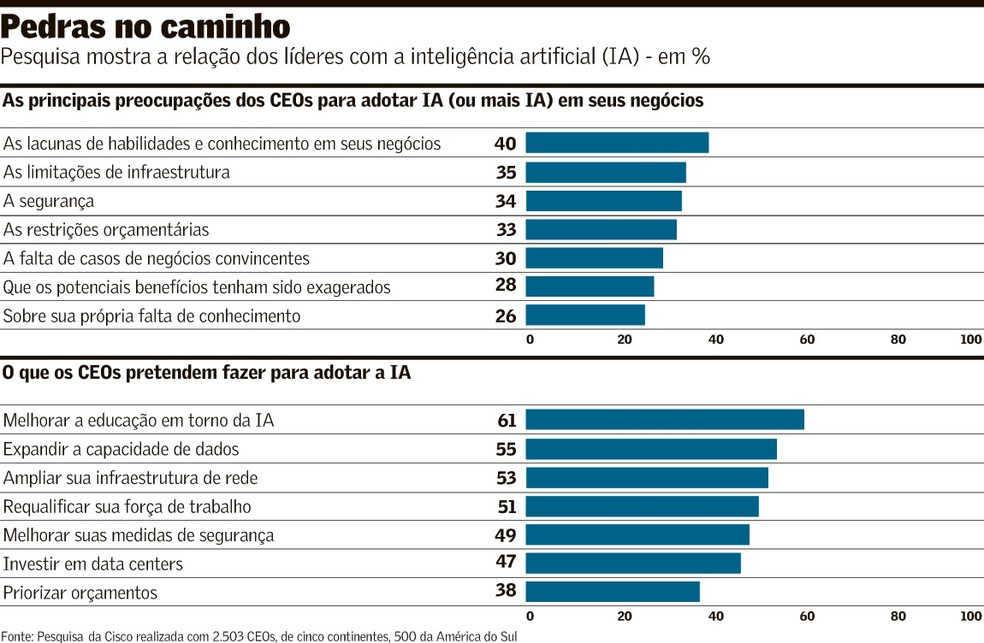 Essas são algumas das tendências levantadas em pesquisa realizada pela Cisco com 2.503 CEOs de companhias com mais de 250 funcionários em cinco continentes, sendo 501 da América do Sul, oferecida com exclusividade ao Valor. “Mais da metade dos entrevistados teme que esse gap [de conhecimento] possa colocar em risco as oportunidades de mercado”, diz Renier Souza, diretor de tecnologia (CTO) e diretor de engenharia da Cisco no Brasil.