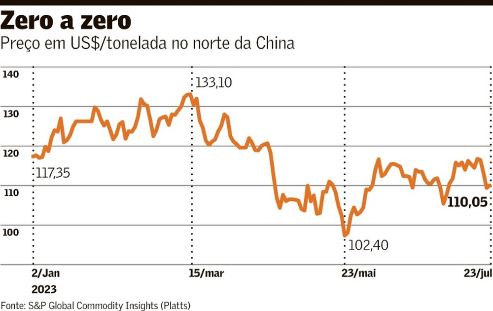 No norte da China, segundo índice Platts, da S&P Global Commodity Insights, o minério com teor de 62% de ferro subiu 0,6% ontem, para US$ 110,05 por tonelada, sem fôlego para compensar as perdas da semana passada. No ano, a desvalorização segue superior a 6%.