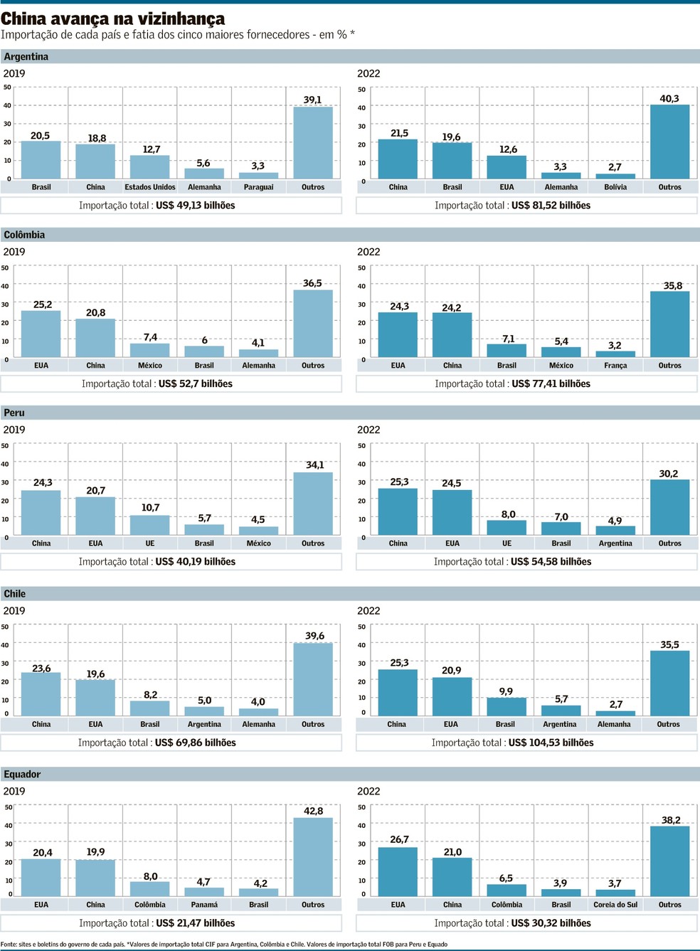 De 2019 para 2022 os produtos brasileiros recuaram na Argentina, onde além de perder fatia de mercado, também viram os chineses tomarem a posição histórica do Brasil de exportador líder durante a pandemia. Também houve recuo de participação no Equador, onde o Brasil é seguido de perto por outro país asiático, a Coreia do Sul.