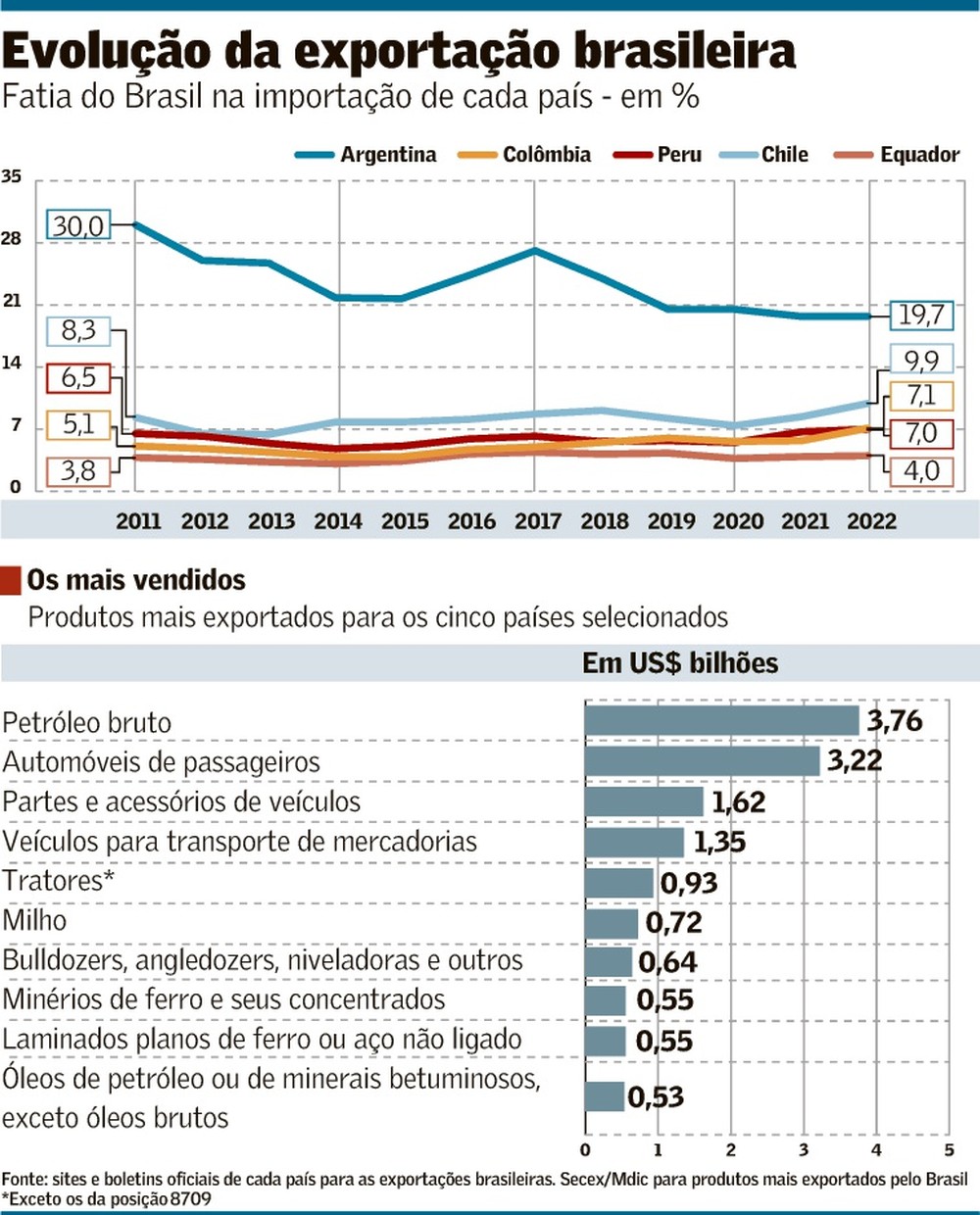 Segundo dados da Secex, no conjunto dos mesmos cinco países sul-americanos, o petróleo bruto foi o primeiro item da pauta de exportação brasileira em 2021 e no ano passado. Em 2022, o Brasil vendeu a esses vizinhos US$ 3,76 bilhões em óleos brutos de petróleo e minerais betuminosos, cerca de US$ 500 milhões a mais do que vendeu em automóveis para passageiros. Em 2019 o quadro era outro. Os veículos estavam no topo da lista, no valor de US$ 2,91 bilhões. O petróleo vinha em segundo lugar, mas com diferença larga para os automóveis, com venda total de US$ 1,2 bilhão.