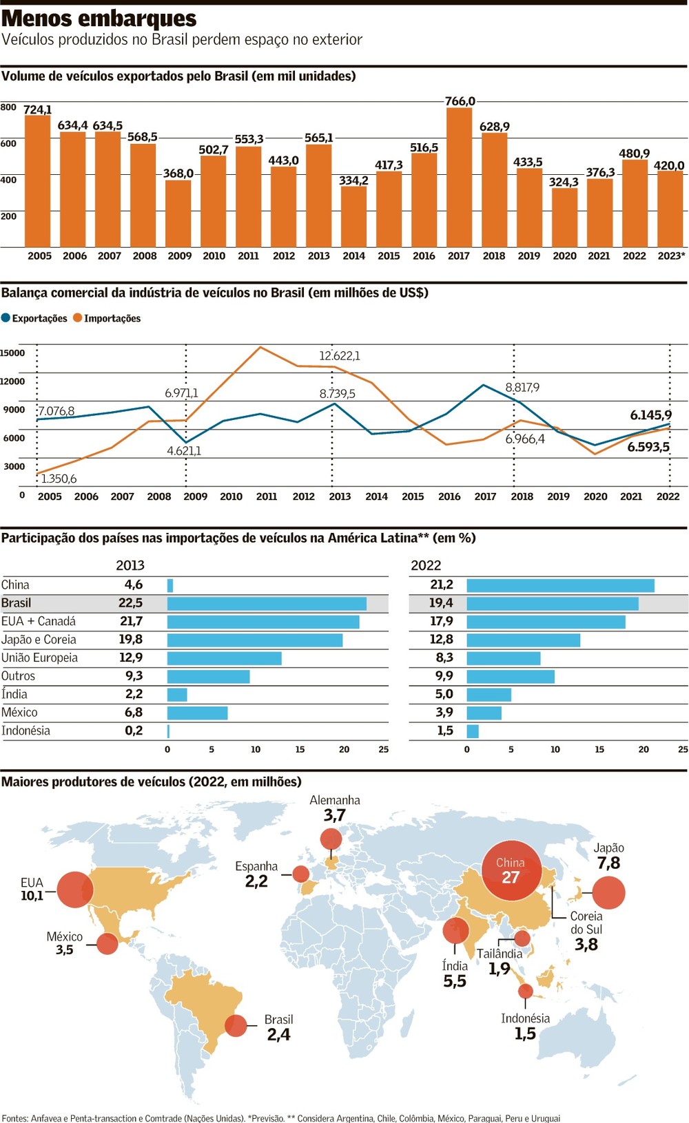 Há pouco mais de um mês a Associação Nacional dos Fabricantes de Veículos Automotores (Anfavea) reduziu a previsão de queda nas vendas externas em 2023. Espera agora o embarque de 420 mil veículos este ano, incluindo automóveis, caminhões e ônibus.