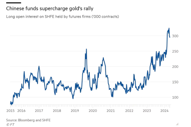 Gold volumes on SHFE surged to more than five times last year’s average at 1.3mn lots on the peak day of trading last week, a trading frenzy that analysts say helps explain the ferocity of gold’s record-breaking rally to above $2,400 a troy ounce this month.