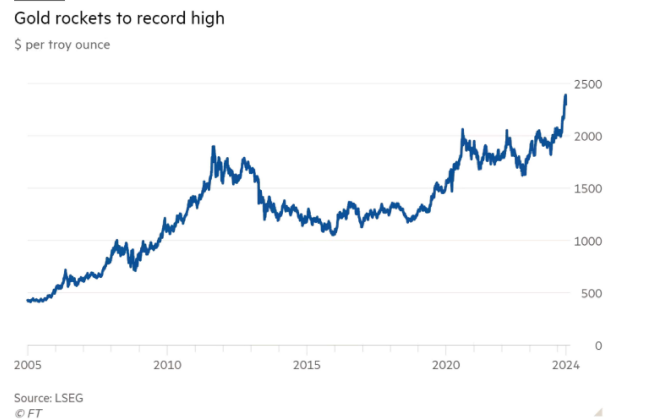 The metal, which is often used as a hedge against inflation and currency depreciation, has been further boosted by its safe haven status since the outbreak of the Israel-Gaza conflict in October, hitting an all-time peak of $2,431 per troy ounce last week.