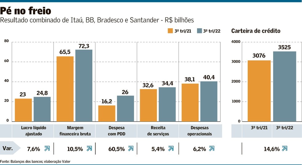 Juntos, Itaú Unibanco, Bradesco, Banco do Brasil (BB) e Santander tiveram lucro de R$ 24,784 bilhões de julho a setembro, com alta de 7,6% ante o mesmo período do ano passado. A carteira de crédito avançou 14,5%, a R$ 3,525 trilhões, mostrando o aumento dos juros não desacelerou as concessões como se esperava. Porém, as taxas mais elevadas e a inflação persistente colaboraram para elevar a inadimplência, refletindo a piora na capacidade de pagamento dos tomadores. Com isso, as provisões para devedores duvidosos (PDD) saltaram 60,5%, a R$ 26 bilhões.