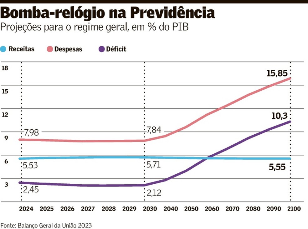 Paiva se baseia nos números do próprio governo. O Balanço Geral da União de 2023 projeta que no ano 2100 o déficit do regime geral de previdência será quase o dobro da receita (ver quadro). De hoje até 2030, receita, despesa e déficit permanecerão mais ou menos constantes pelo critério de proporção do PIB. Depois disso, a receita se mantém estável enquanto a despesa dispara e dobra de tamanho – e o déficit, claro, acompanha. Isso apenas 11 anos depois de promulgada uma reforma no sistema previdenciário.