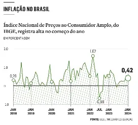 Foram os itens alimentícios que turbinaram o IPCA em janeiro, embora o encarecimento dos serviços bancários e dos planos de saúde também tenha pressionado a inflação do mês, disse o gerente do IBGE. Diante das condições climáticas desfavoráveis, os alimentos mais caros foram responsáveis por dois terços da inflação neste início de 2024.