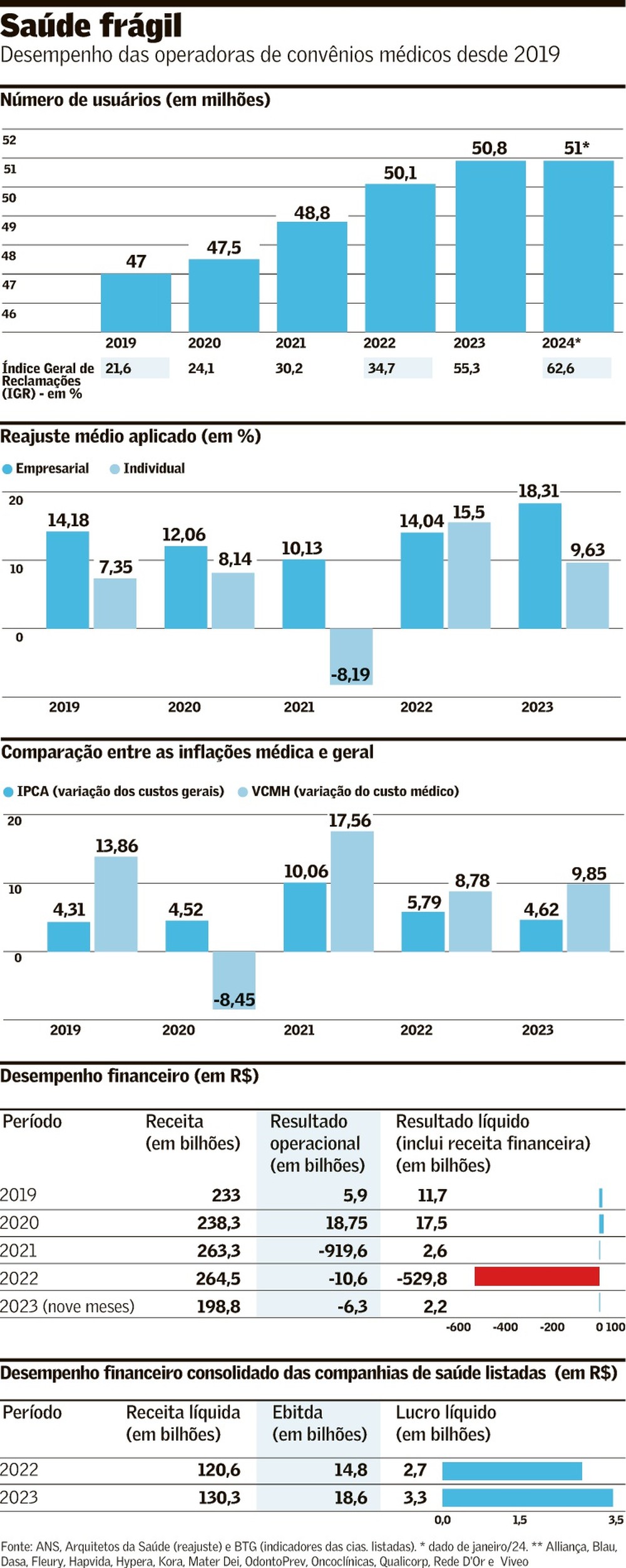 Os planos de saúde passam por uma deterioração, com rede credenciada menor, maior cobrança de coparticipação, queda no valor do reembolso, além de reajustes recordes. O índice de queixas na Agência Nacional de Saúde Suplementar (ANS) mais do que dobrou nos últimos três anos. Esse cenário é reflexo da crise das operadoras, que acumulam prejuízo operacional de R$ 18 bilhões, entre 2021 e 2023 (até setembro).