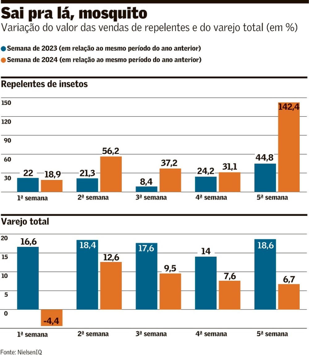 O aumento de casos de dengue em todo o Brasil – já são mais de 653 mil casos prováveis, com 113 mortes – tem provocado forte demanda por repelentes neste verão, com impacto no bolso do consumidor. Em janeiro, as vendas dos produtos que protegem contra picadas de mosquitos avançaram 48,3% em relação ao mesmo mês de 2023, segundo pesquisa da Nielsen IQ, obtida com exclusividade pelo Valor. Esse crescimento é 12 vezes maior do que as vendas de todo o varejo no mesmo intervalo. Os preços sobem mais de 15% desde dezembro (ver nesta página).