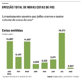 Os exemplos de follow on (oferta de ações) são muitos e vão além de apenas uma impressão. O número de emissões de fundos imobiliários disparou recentemente. Dados levantados pela Economatica, a pedido do E-Investidor, plataforma eletrônica do Estadão sobre investimentos, mostram que somente em julho foram 19,3 milhões de novas cotas. É o maior volume para um mês em 2023, quase o dobro da soma emitida em abril, maio e junho.