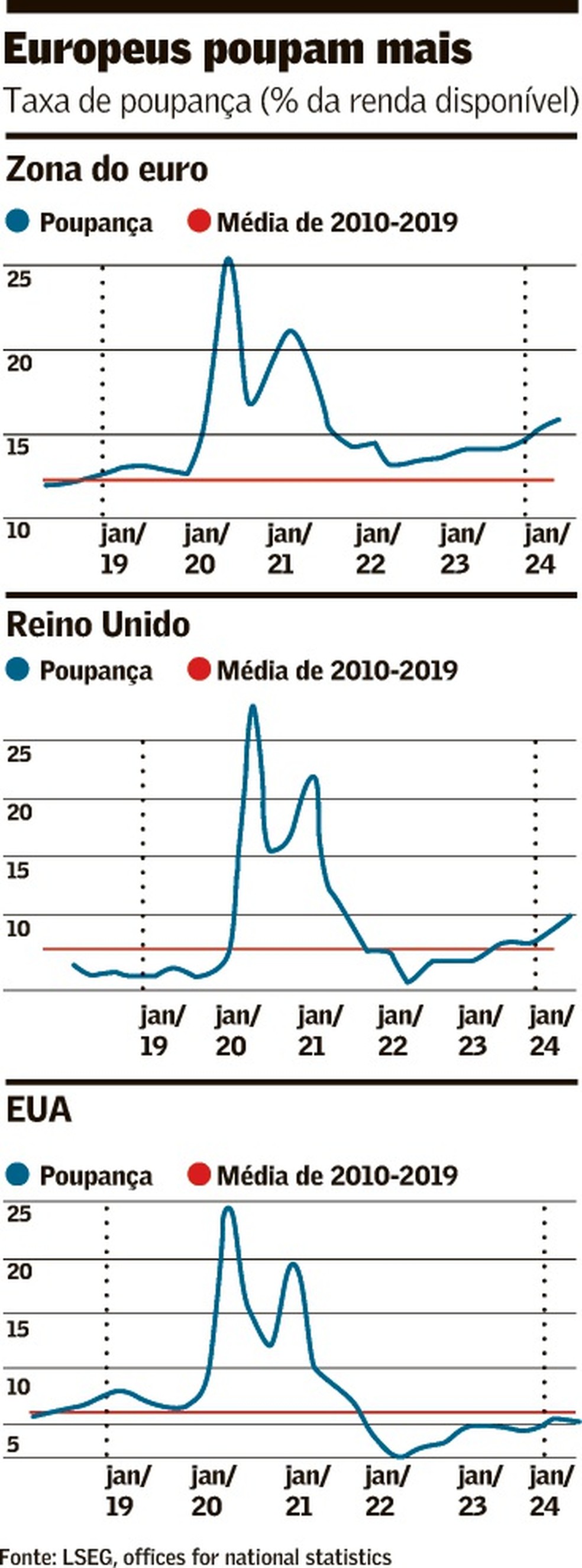 No Reino Unido, os consumidores também se mostram cautelosos. A taxa de poupança das famílias britânicas no segundo trimestre subiu para 10%, o maior nível em três anos, bem acima da média de 7,5% do período de 2010 a 2019, apesar das revisões para baixo, segundo dados oficiais divulgados na semana passada.
