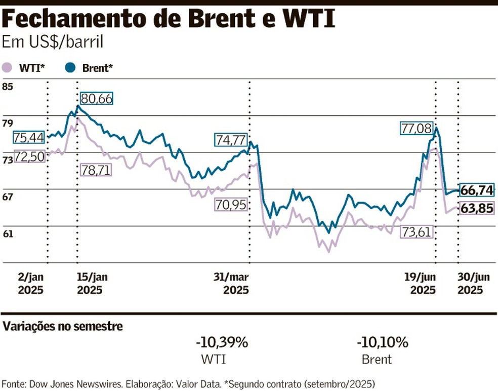 As cotações do barril do petróleo no primeiro semestre oscilaram entre uma equação que de um lado uniu oferta em expansão com demanda tímida e, de outro, tensões geopolíticas que trouxeram incerteza aos investidores. Ao fim do período, o arrefecimento do conflito entre Israel e Irã permitiu que prevalecesse no mercado de petróleo o efeito econômico de uma produção crescente e uma procura mais fraca. Com isso, o barril do tipo Brent fechou os seis primeiros meses do ano em queda de 10,1%, cotado a US$ 66,74, enquanto o WTI, referência nos Estados Unidos, caiu 10,39% no mesmo período, para US$ 63,85.
