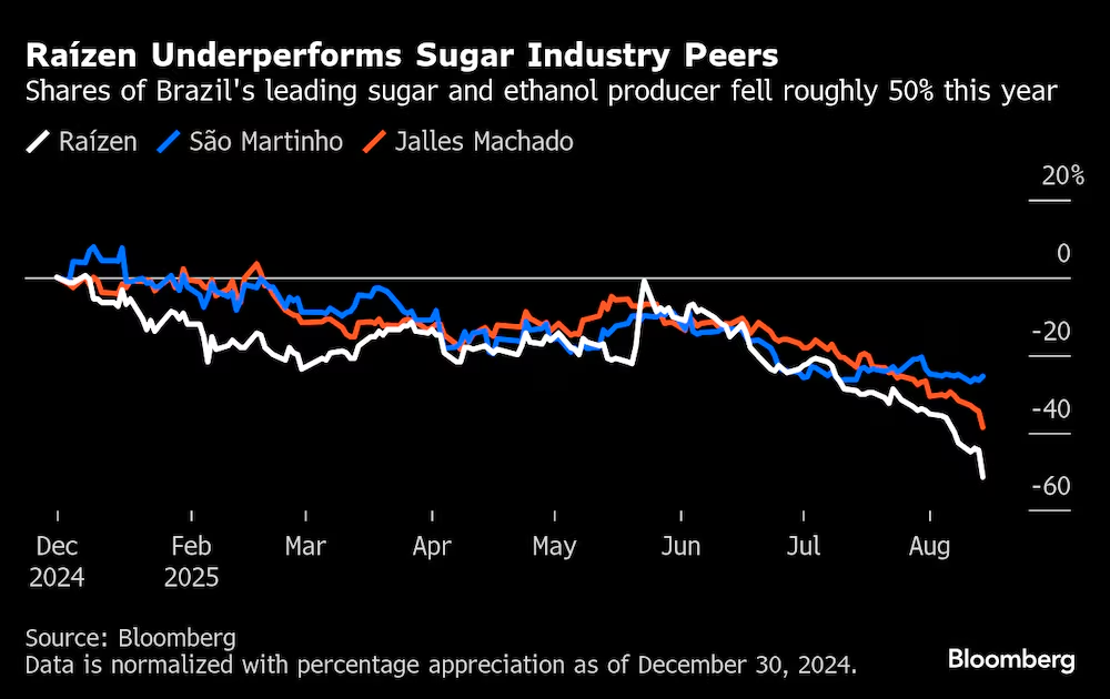 Ações da Raízen estão com desempenho pior do que o dos concorrentes São Martinho e Jalles Machado desde dezembro de 2024