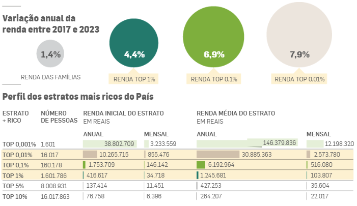 Entre 2017 e 2023 (último ano com dados disponíveis), a renda do 0,1% mais rico cresceu 6,9% ao ano, bem mais do que o Produto Interno Bruto (PIB) e do que a renda média das famílias brasileiras (+1,4%).