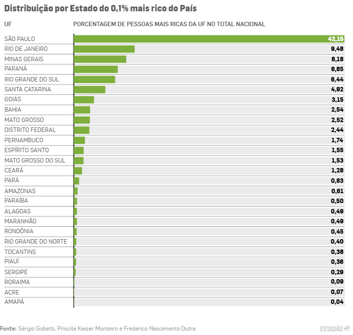 Ainda assim, as pessoas de elevada renda são menos numerosas do que em São Paulo, onde vivem 4 de cada 10 pessoas que fazem parte do seleto grupo dos 0,1% mais ricos. O Rio de Janeiro é o segundo Estado de maior concentração desse grupo de super-ricos.