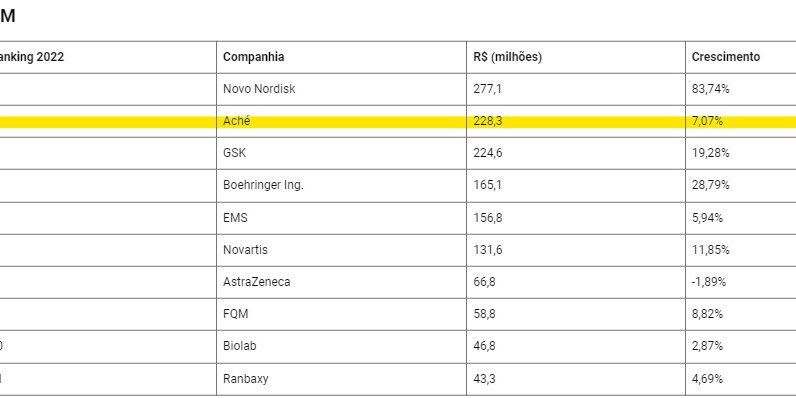 O Aché perdeu a liderança conquistada no ano passado, ficando na segunda colocação, com R$ 228,3 milhões – crescimento de 7,07% e 12,55% de participação. Fechando o top 3 vem a GSK, que apresentou R$ 224,6 milhões de receita.