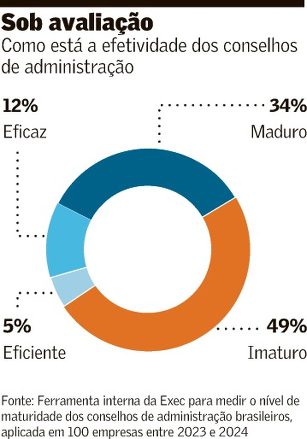 Ao longo de 2023 e 2024, o estudo avaliou o perfil dos conselhos de cerca de cem empresas de grande porte no país e descobriu que 17% dos boards são considerados eficientes ou eficazes, 34% são maduros e 49% são imaturos. O levantamento analisou as seguintes dimensões nos colegiados: dinâmica, alinhamento com a estratégia, a cultura e a gestão, e olhar voltado para o digital e para as tendências. “A imaturidade dos conselhos está relacionada à dinâmica, ao desalinhamento do planejamento estratégico, tempo de mandato, papéis e responsabilidades, além de déficits claros nos princípios básicos da transparência, equidade, prestação de contas e responsabilidade corporativa”, aponta Sérgio Simões, sócio da Exec.