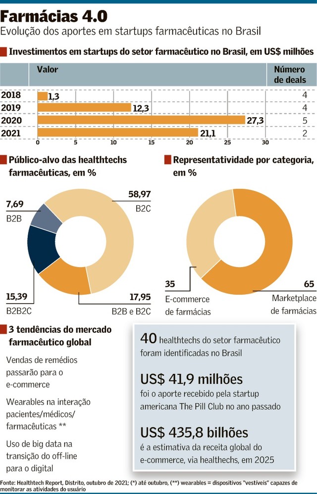 Seis em cada dez startups (58,9%) do setor farmacêutico desenvolvem soluções exclusivamente para o consumidor final. O restante (41,1%) mantém contratos com empresas e seus clientes. É o que indica estudo da plataforma de inovação Distrito, que mapeou 40 negócios no segmento. Entre as inovações, há operações que funcionam como farmácias 100% on-line ou que facilitam a entrega em domicílio de medicamentos prescritos em receitas digitais.