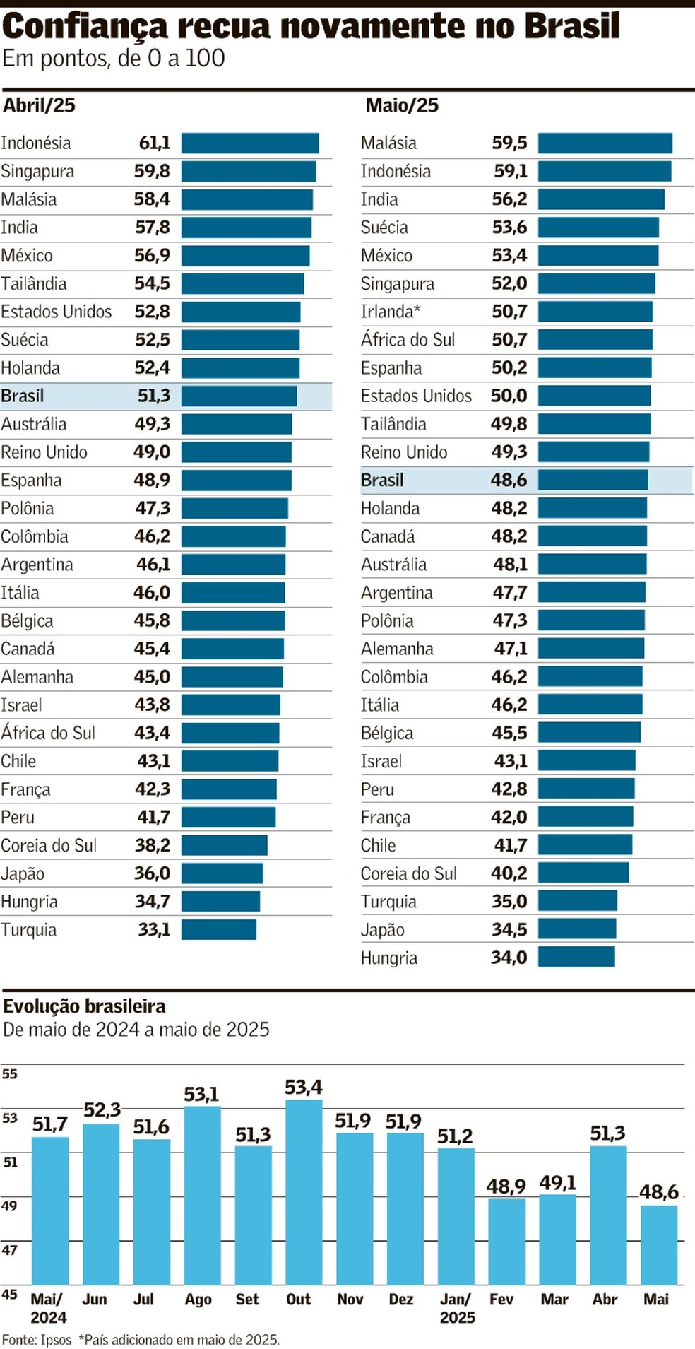 O indicador marcou no mês passado 48,6 pontos, numa escala de 0 a 100 – pontuação abaixo de 50 indica pessimismo -, menor patamar desde agosto de 2022. Na comparação com abril, a queda foi de 2,7 pontos. Em relação a maio de 2024, a queda foi de 3,1 pontos, sexta maior entre os 30 países pesquisados.