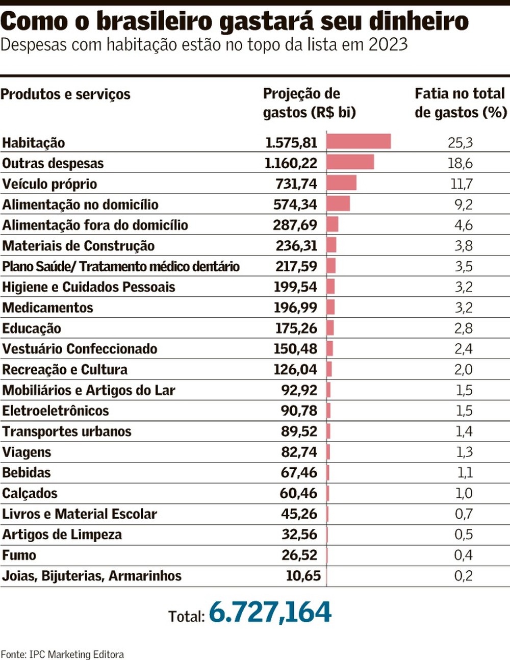 Pesquisa IPC Maps projeta que as famílias brasileiras gastarão cerca de R$ 6,7 trilhões ao longo deste ano, aumento real de 1,5% em relação a 2022. Caso essa previsão seja confirmada, será a pior variação do consumo das famílias desde o começo da pandemia em 2020, quando caiu 4,6%; e quase um terço do crescimento observado no ano passado. Em 2022, o consumo das famílias cresceu 4,3%, dentro do Produto Interno Bruto (PIB), calculado pelo Instituto Brasileiro de Geografia e Estatística (IBGE).