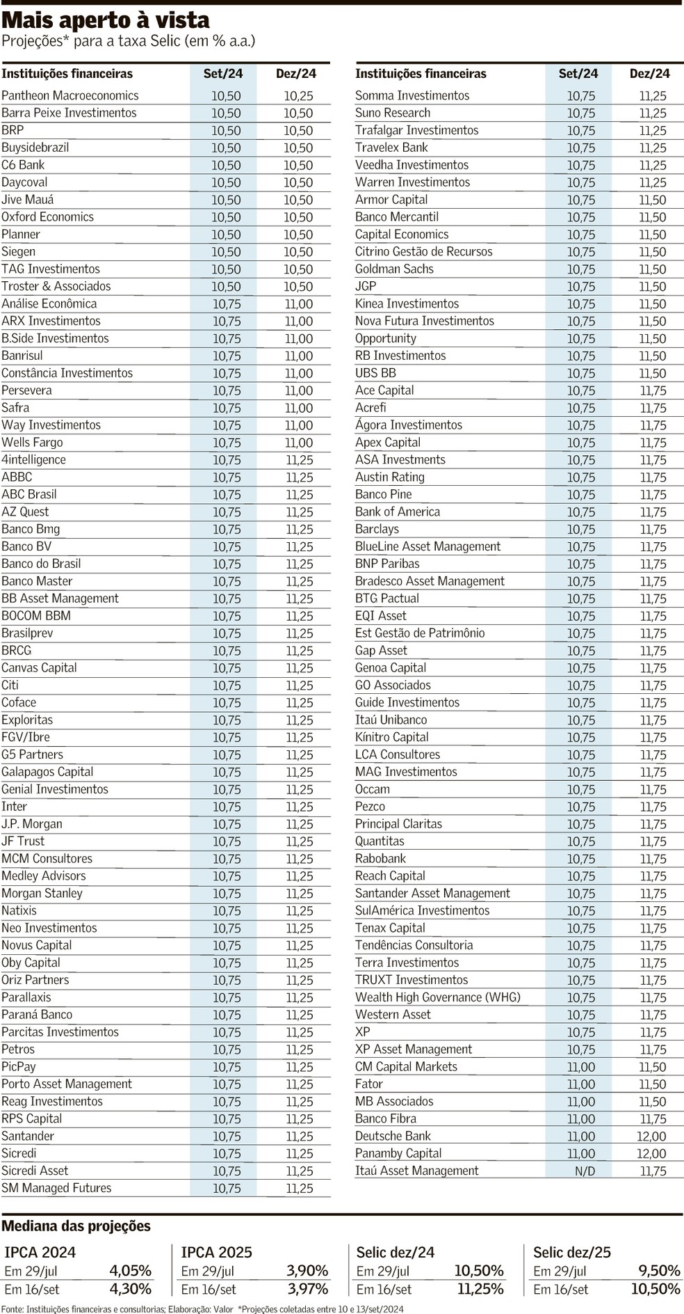 Ferraz e Megale concordam quanto ao nível total de ajuste a ser implementado pelo BC, ao projetarem a Selic indo a 12% no começo do próximo ano. Há no mercado, porém, quem veja um caminho mais gradual e um ciclo menor de aperto pela frente, como a economista-chefe do Bocom BBM, Cecília Machado, ao projetar a Selic indo a 11,25% no fim deste ano e a 11,5% no começo de 2025 — exatamente o consenso da pesquisa do Valor.