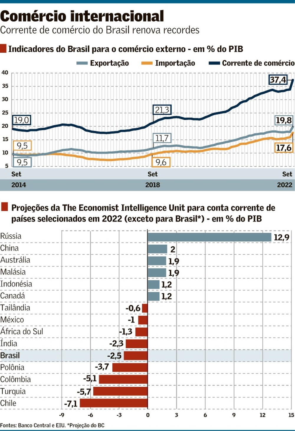 A partir de dados do Banco Central, o Bank of America (BofA) mostra que a corrente de comércio do Brasil, medida pelo seu peso sobre o PIB do país, renovou recorde em setembro deste ano, chegando a 37,41%, ante 31,84% em igual período de 2021 e 22,92% em setembro de 2019, antes da pandemia.
