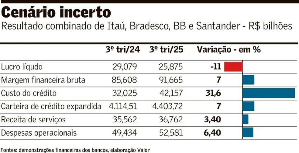 Em contraste com a desaceleração das operações, o custo do crédito subiu. As despesas com provisões para devedores duvidosos (PDD) aumentaram 31,6% frente ao terceiro trimestre de 2024, chegando a R$ 42,157 bilhões na soma dos quatro bancos. O crescimento ofuscou a alta de 7% na margem financeira bruta combinada, que totalizou R$ 91,665 bilhões.