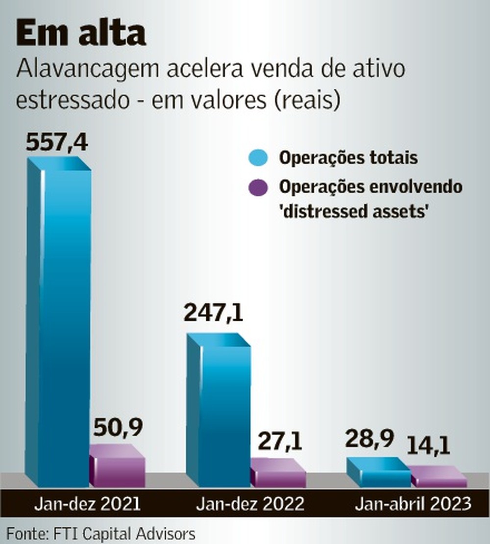 Se considerados os valores, essa proporção é maior. De janeiro a abril deste ano, esse perfil respondeu por cerca de R$ 14 bilhões dos negócios fechados. Ou seja, dos R$ 28,9 bilhões movimentados em M&As, quase metade (48,6%) envolveu ativos estressados. Em 2022, essa fatia era de 11% e, em 2021, de 9,1%.