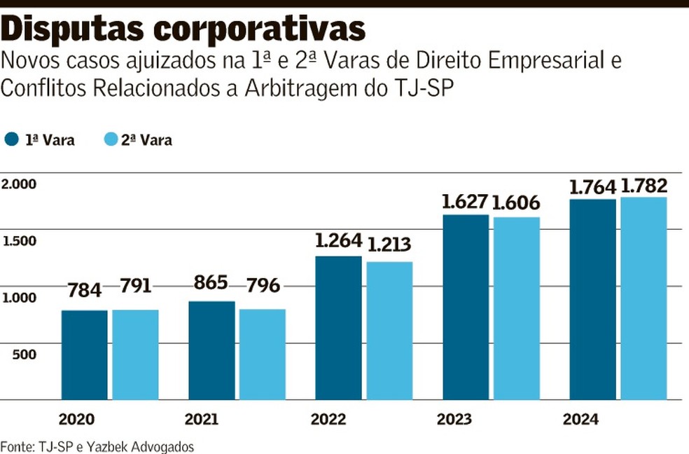 Para se ter uma dimensão, no ano passado foram ajuizados 1,76 mil novos casos na 1ª Vara de Direito Empresarial e Conflitos Relacionados a Arbitragem do Tribunal de Justiça de São Paulo (TJ-SP), aumento de 8,4% em relação ao ano anterior. Em comparação com 2021, o crescimento foi de 104%, segundo levantamento feito pelo escritório Yazbek Advogados ao Valor. Já na 2ª Vara foram 1.782 novos casos, alta de 11,6% no comparativo anual e de 124% em três anos. Nas câmaras arbitrais, a estimativa é que 90% dos casos se tratem de litígios societários.
