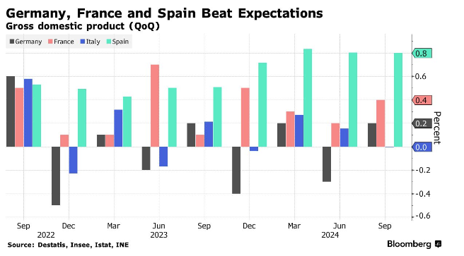 A maioria das maiores economias da zona do euro expandiu no terceiro trimestre — e até mesmo a Alemanha conseguiu evitar a recessão que muitos analistas previam. O crescimento acelerou na França e se manteve estável na Espanha, superando as expectativas. A Alemanha surpreendeu com um aumento de 0,2% no Produto Interno Bruto (PIB), pegando analistas de surpresa, embora o valor dos três meses anteriores tenha sido revisado significativamente para baixo.