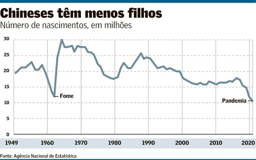 A taxa de natalidade da China está em declínio há muitos anos. Entre o início do governo de Xi, em 2012, e 2021, o número de bebês nascidos a cada ano caiu mais de 45%, para 10,6 milhões.