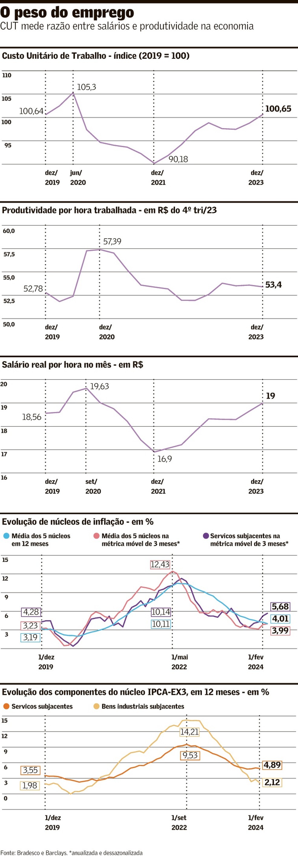 Fator importante que ajudou a manter a inflação, sobretudo de serviços, relativamente comportada ao longo do ano passado apesar do cenário de desemprego baixo, o custo unitário do trabalho (CUT) retornou ao patamar pré-covid na virada de 2023 para 2024. A situação, dizem economistas, exige cautela do Banco Central, cujo Comitê de Política Monetária (Copom) está reunido para mais uma decisão sobre a taxa de juros do país.