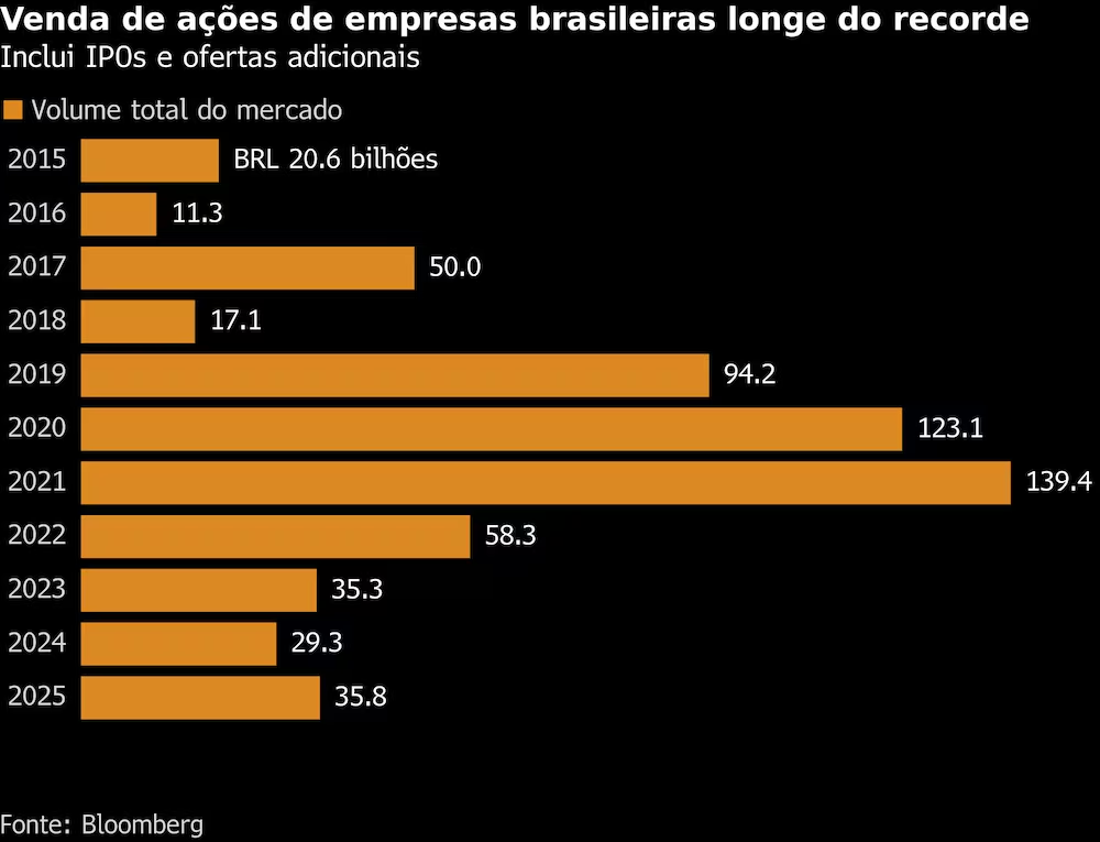 O total de ofertas de ações no Brasil atingiu R$ 35,8 bilhões em 2025, um aumento de 22% em relação a 2024, segundo dados compilados pelaBloomberg. Ainda assim, o valor está bem longe do recorde de R$ 139,4 bilhões em 2021.