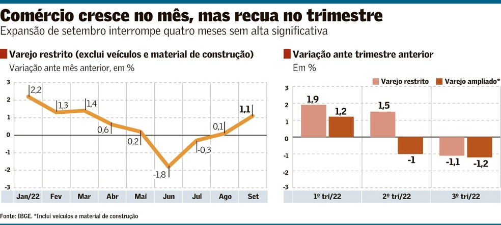 Segundo a Pesquisa Mensal do Comércio (PMC), do Instituto Brasileiro de Geografia e Estatística (IBGE), o volume de vendas no varejo restrito teve alta de 1,1% em setembro, ante agosto, na série com ajuste sazonal, e 3,2% em relação ao mesmo mês de 2021. O resultado veio acima das medianas estimadas pelo Valor Data, que eram de, respectivamente, 0,2% e 1,2%.