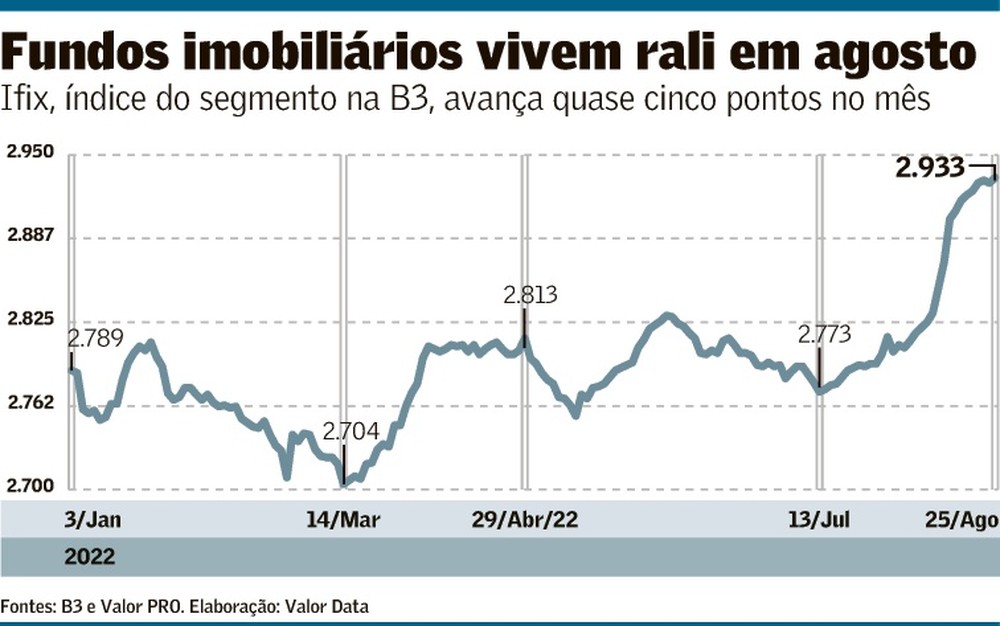 Levantamento da Hedge Investments para o Valor mostra que a categoria de fundos de CRIs que fazem parte do Ifix exibia, no agregado de valorização de cotas e rendimentos distribuídos, uma alta de 4,04% em 2022 até o fim de julho. Esse ganho, praticamente, sustentou o referencial dos FIIs listados no terreno positivo no período, com alta de 0,33%.