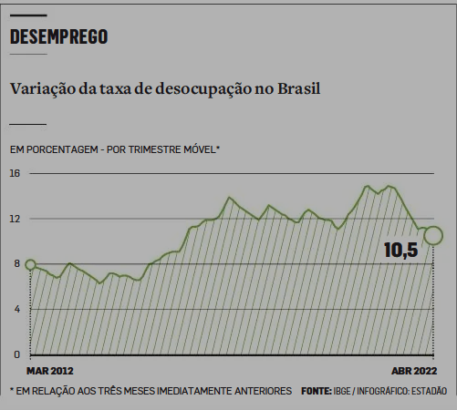 A taxa de desemprego caiu para 10,5% no trimestre encerrado em abril, uma melhora em relação ao índice de 11,1% do período terminado em março, segundo a Pesquisa Nacional por Amostra de Domicílios Contínua (Pnad Contínua), divulgada ontem pelo IBGE. Já a renda média, de R$ 2.569, é 7,9% inferior à que os trabalhadores recebiam há um ano.