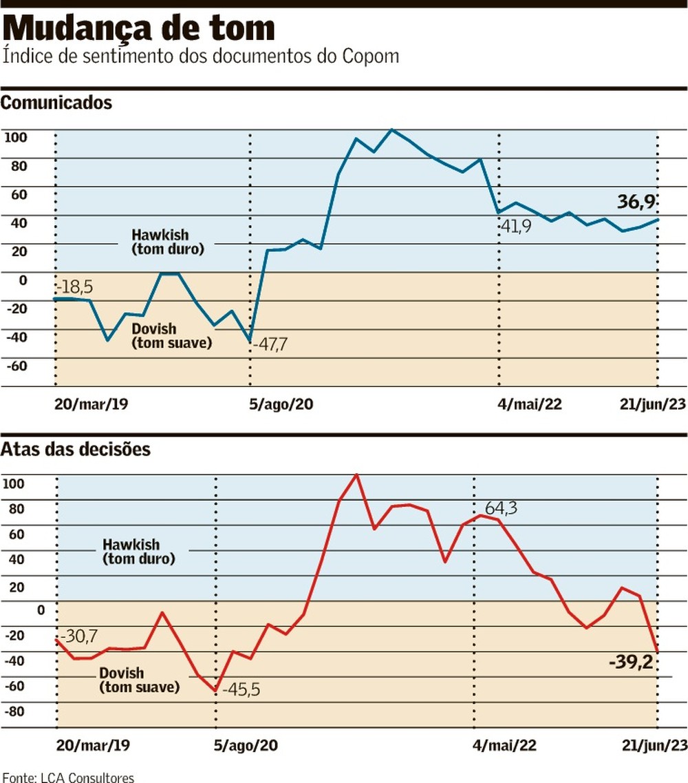 “Temos visto comunicados do Copom mais duros, até porque é a primeira versão que o Banco Central utiliza para comunicar aquela decisão aos agentes do mercado e aos agentes políticos. Depois, essa postura mais agressiva é compensada nas atas, que trazem um conjunto de informações mais detalhado e, por eles, é possível entender melhor a cabeça do Copom”, observa o economista Bruno Imaizumi, da LCA Consultores, que elaborou os indicadores. Nos dois índices, tanto no do comunicado quanto no da ata, resultados acima de zero indicam um tom mais duro, enquanto números abaixo de zero apontam para um tom suave.