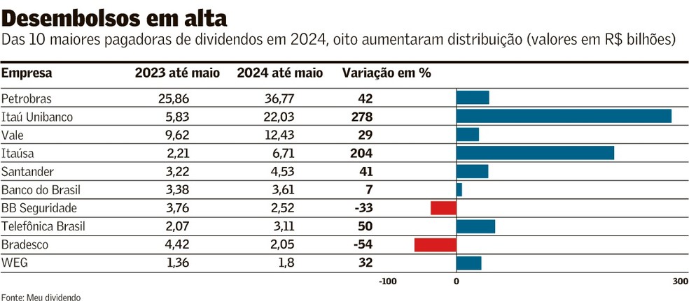 Em um ritmo até agora mais forte que o registrado no ano passado, o pagamento de dividendos pelas companhias brasileiras em 2024 caminha para ao menos repetir o de 2023, quando foram distribuídos cerca de R$ 224 bilhões aos acionistas. O endividamento menor das empresas, associado a um baixo investimento, tem aliviado a pressão sobre o lucro. As maiores expectativas, entretanto, recaem sobre nomes já conhecidos dos investidores que desejam ganhos para além da valorização dos papéis.